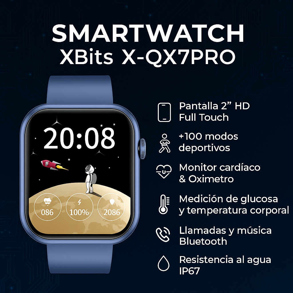 El Smartwatch XBits X-QX7PRO es un reloj inteligente de última generación con pantalla HD de 2 pulgadas full touch, más de 100 modos deportivos y avanzadas funciones de salud como monitor cardíaco, oxímetro, medición de glucosa y temperatura corporal. Su diseño resistente al agua IP67, correa de silicona cómoda y opciones de personalización lo convierten en el compañero ideal para quienes buscan rendimiento, conectividad y estilo en un solo dispositivo.